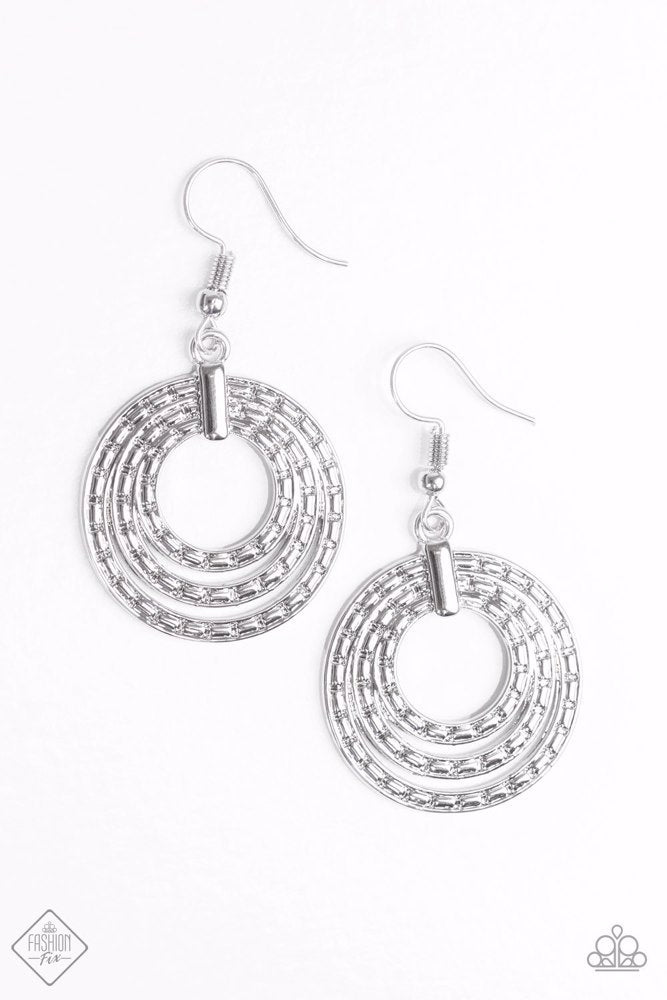 Pinched between a shiny silver fitting, shimmery textured hoops layer into a dizzying lure. Earring attaches to a standard fishhook fitting.