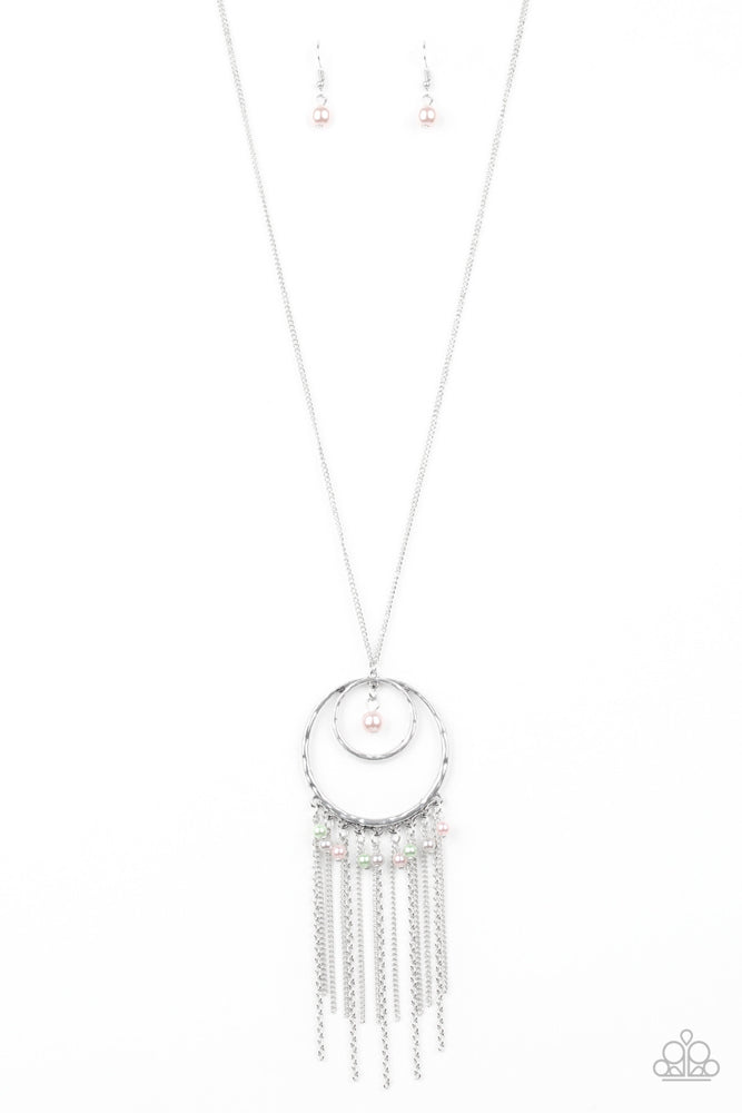 An airy circular pendant swings from the bottom of a lengthened silver chain. Infused with a solitaire pink pearl swings from the top of the frame, a fringe of multicolored pearls and shimmery silver chains stream from the bottom of the pendant for a refined finish. Features an adjustable clasp closure.