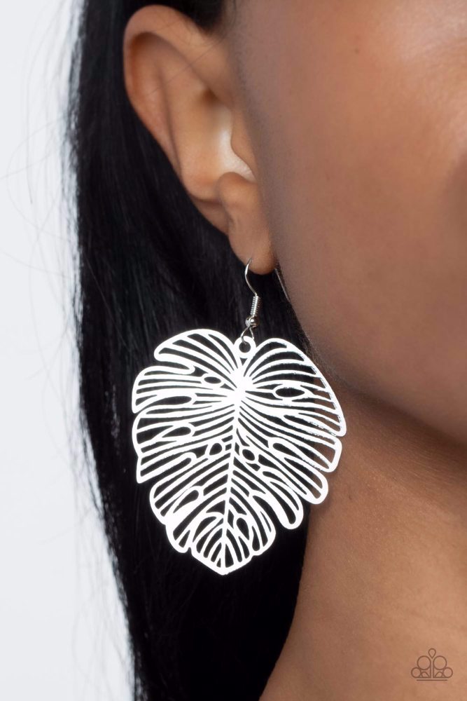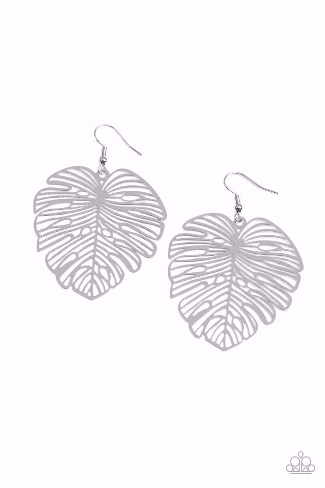 A stenciled silver palm-like leaf delicately swings from the ear, creating a refined seasonal display. Earring attaches to a standard fishhook fitting.