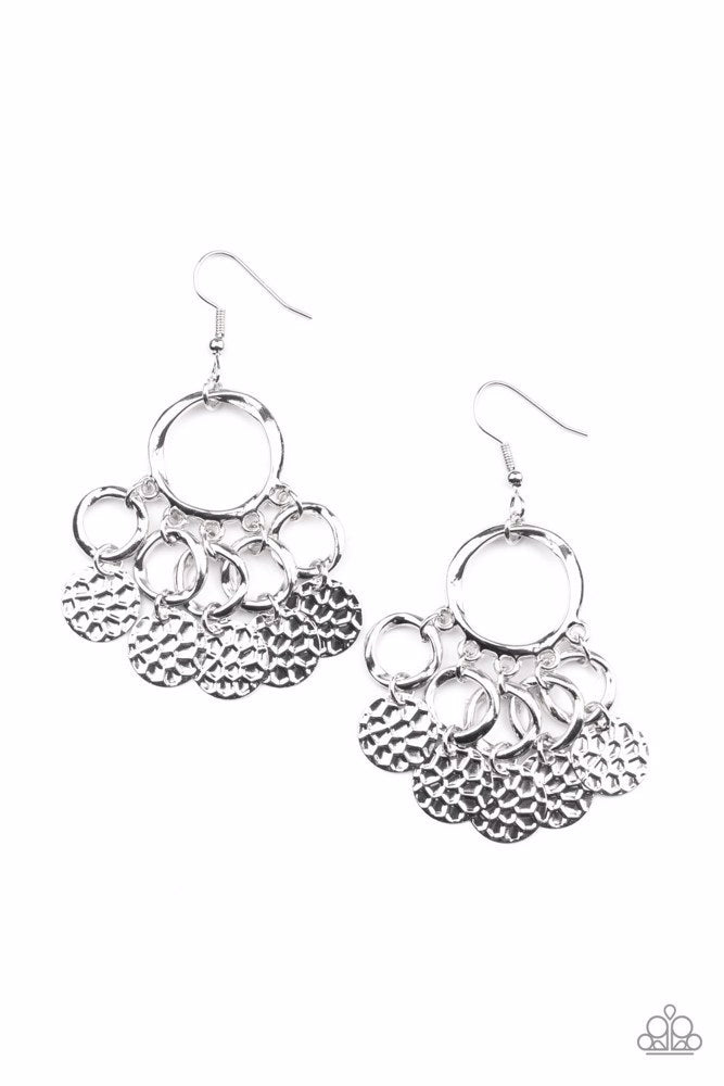 Embossed in tactile geometric patterns, shiny silver discs swing from the bottom of dainty silver rings at the bottom of an asymmetrical silver ring for a noise-making fashion. Earring attaches to a standard fishhook fitting.