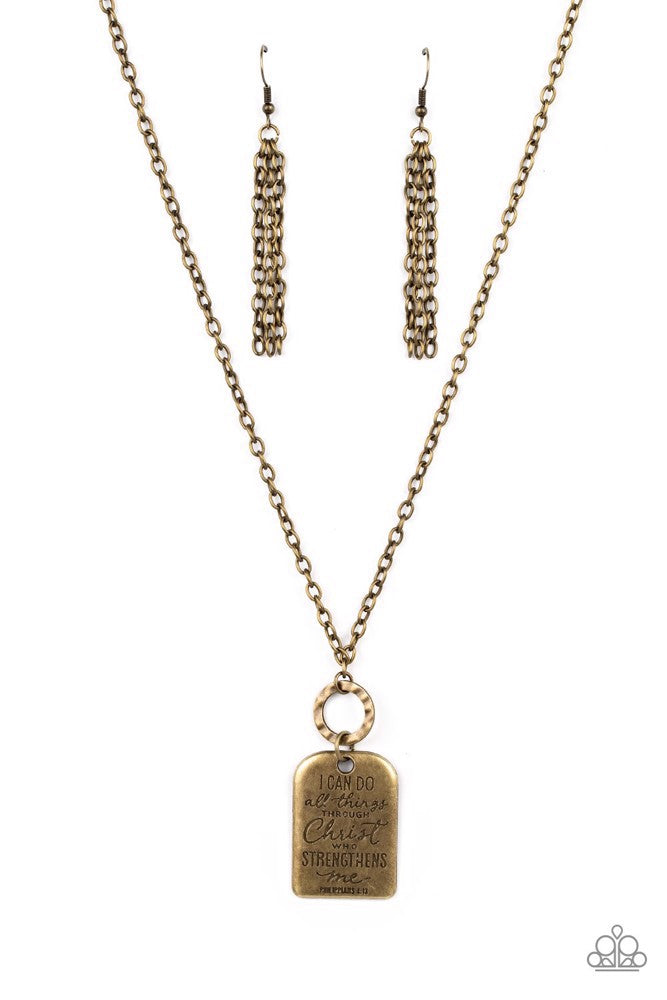 Dangling from a simple brass chain, a hammered brass hoop boosts a rounded rectangular plate. Lightly hammered in gritty detail, the brass pendant is stamped with the popular phrase "I can do all things through Christ who strengthens me" with the scripture reference "Philippians 4:13" listed below it in a daintier font for a hopeful finish. Features an adjustable clasp closure.