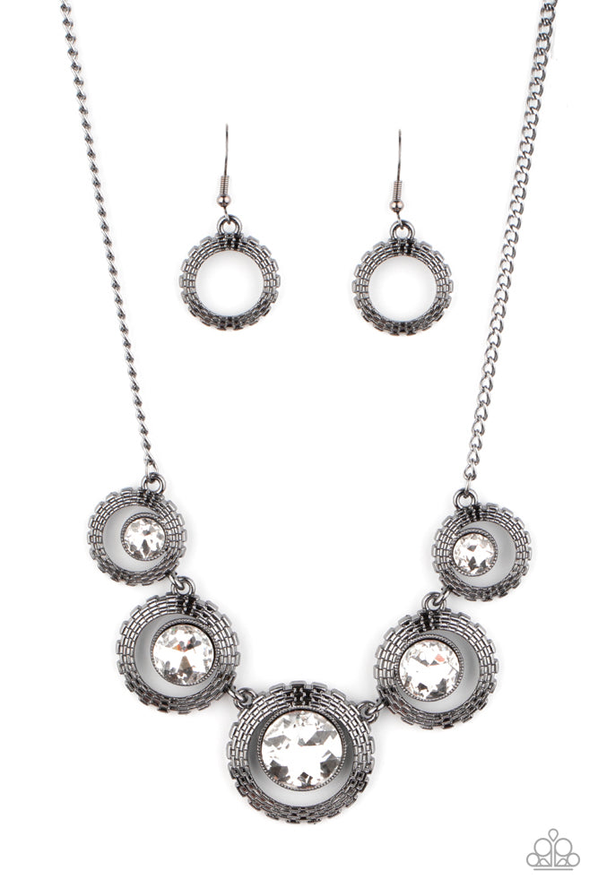 Graduating in size, a series of glittery white rhinestones are asymmetrical nestled inside glistening gunmetal frames featuring box chain-like texture. The edgy display delicately links below the collar, creating an unexpected hint of sparkle. Features an adjustable clasp closure.