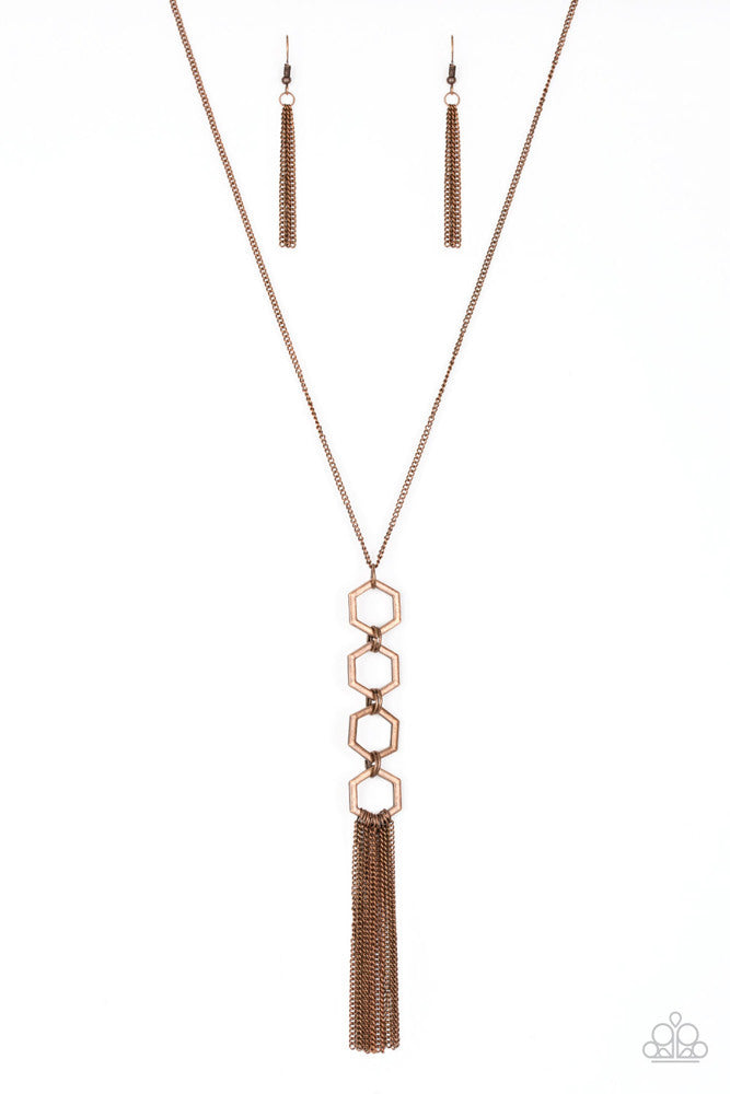Four copper hexagon frames connect at the bottom of a lengthened copper chain, creating an edgy stacked pendant. A glistening copper tassel swings from the bottom of the geometric pendant, adding movement to the modern piece. Features an adjustable clasp closure.