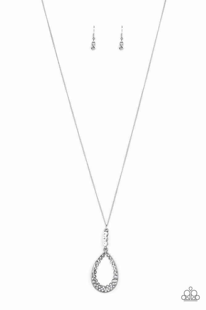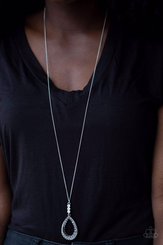Infused with a lengthened silver chain, three white rhinestones give way to a glittery teardrop pendant. Dotted with dainty silver studs, the inside and outside of a silver teardrop is encrusted in white rhinestones for a regal look. Features an adjustable clasp closure.