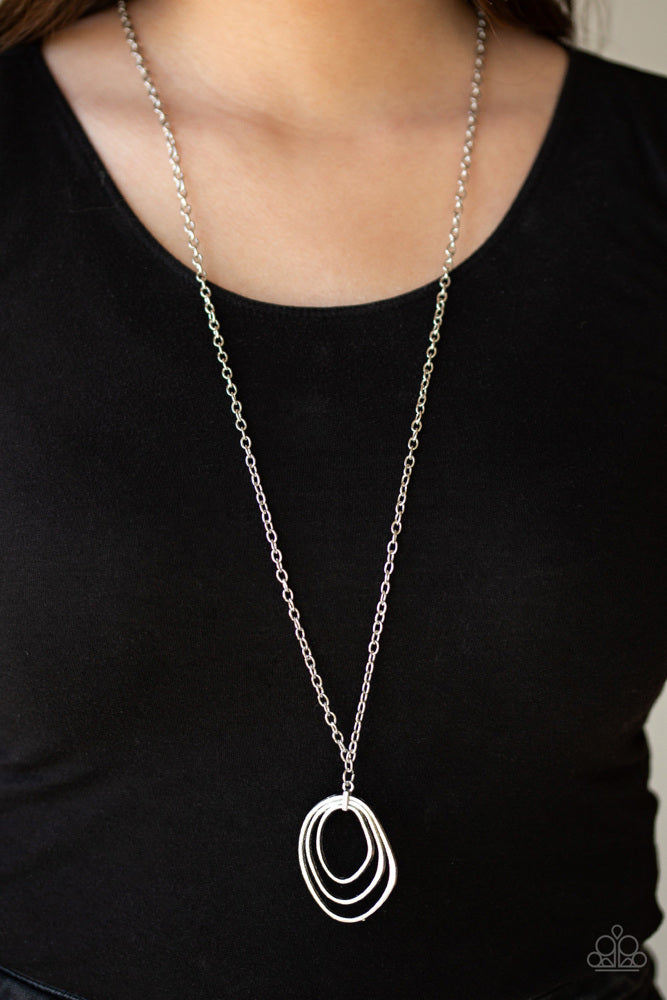 Asymmetrical silver hoops join into an abstract pendant at the bottom of a lengthened silver chain for an industrial flair. Features an adjustable clasp closure.