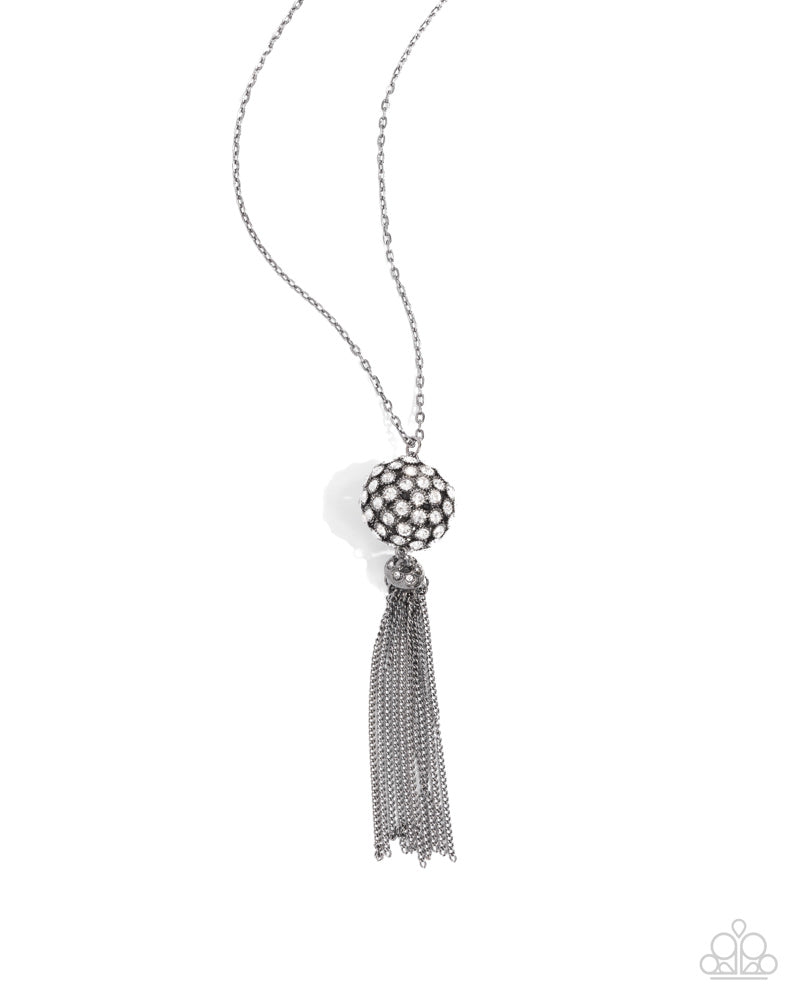 Infused with gunmetal studded fittings, a glittery collection of sparkly white rhinestones coalesce into a dramatic pendant at the bottom of a lengthened gunmetal chain. Capped in a rhinestone dotted frame, a shimmery gunmetal tassel streams out from the blinding pendant for a flirtatious finish. Features an adjustable clasp closure.