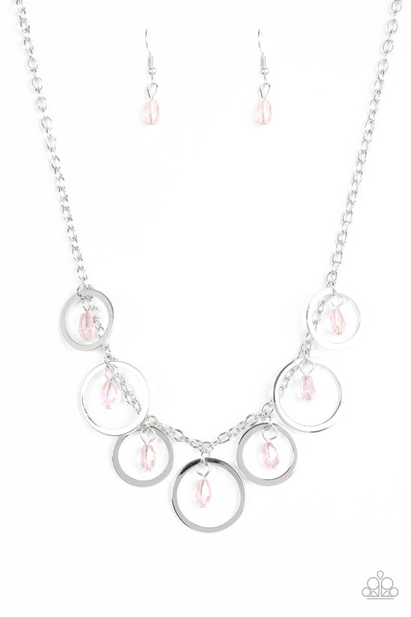 Faceted pink crystal-like beads swing from the tops of shimmery silver hoops. Slightly varying in size, the shiny silver hoops swing from the bottom of a bold silver chain, creating a refined fringe below the collar. Features an adjustable clasp closure.