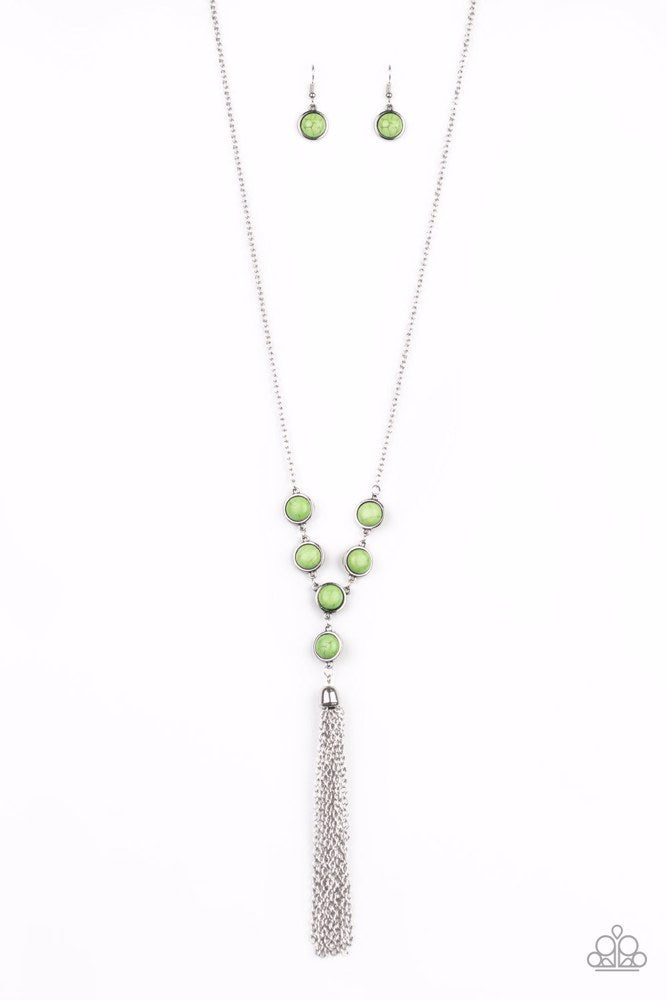 Refreshing green stone frames link at the bottom of a lengthened silver chain, giving way to a shimmery silver chain tassel for a wanderlust finish. Features an adjustable clasp closure.