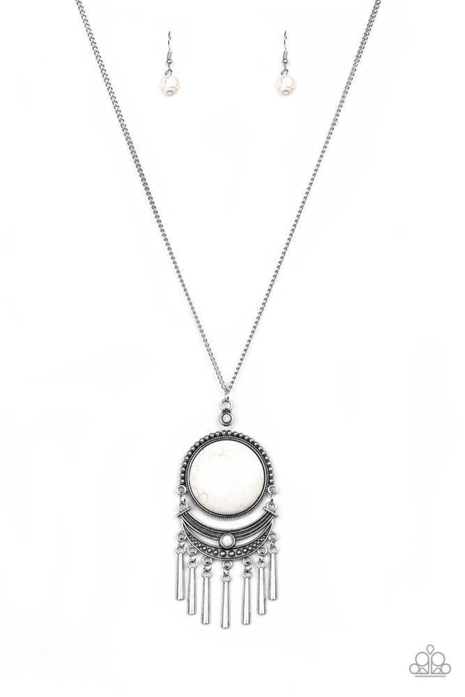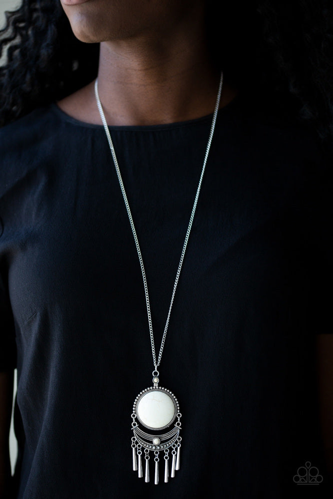 Swinging from the bottom of a lengthened silver chain, a dramatic white stone gives way to an ornate crescent shaped frame dotted with a dainty white stone. Brushed in an antiqued shimmer, flared silver bars swing from the bottom of the dramatic pendant, adding a playful movement to the seasonal palette. Features an adjustable clasp closure.