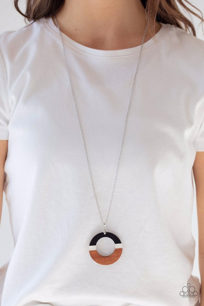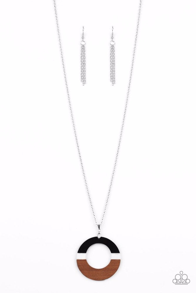 Painted in black and white stripes, an earthy brown wooden hoop swings from the bottom of a lengthened silver chain for a seasonal flair. Features an adjustable clasp closure.