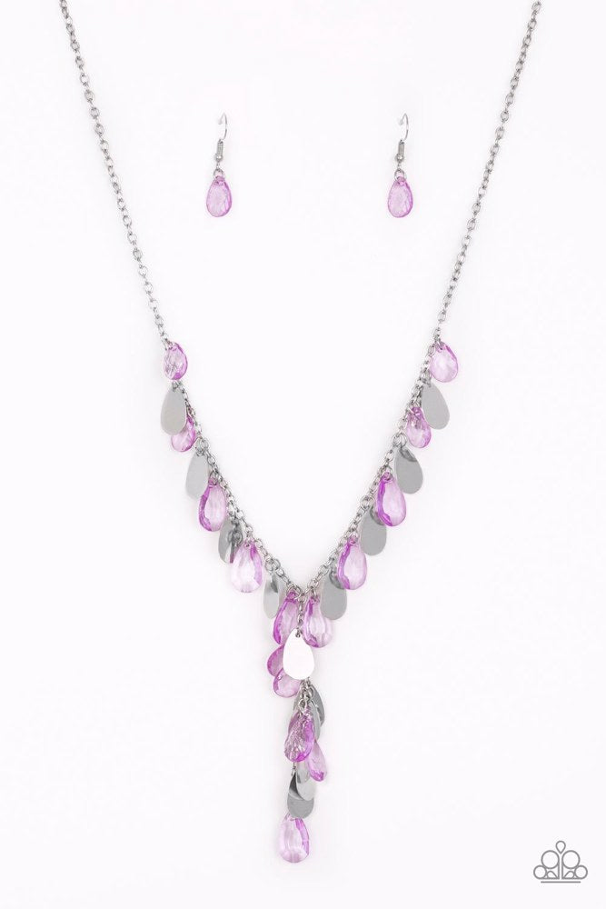 Flat silver teardrops and purple crystal-like teardrops swing from the bottom of a shimmery silver chain below the collar. A matching tassel swings from the center, creating a whimsical extended pendant. Features an adjustable clasp closure.
