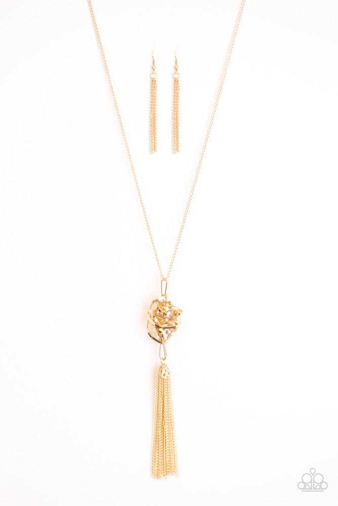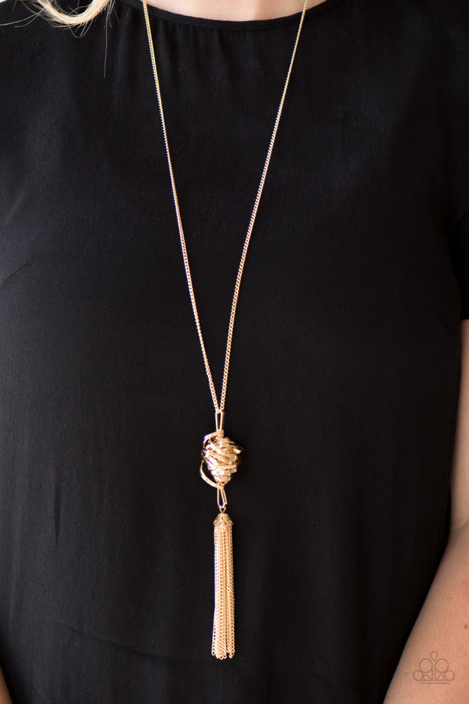 A glistening gold wire wraps into a bold twisted pendant. Infused with an ornate gold bead, shimmery gold chains stream from the bottom of the pendant for a fierce finish. Features an adjustable clasp closure.