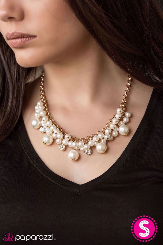 Rows of classic white pearls dance effervescently along the neckline in an airy display. Solitaire rhinestones sparkle between the pearls, adding a glitzy twist to the timeless design. Features an adjustable clasp closure.