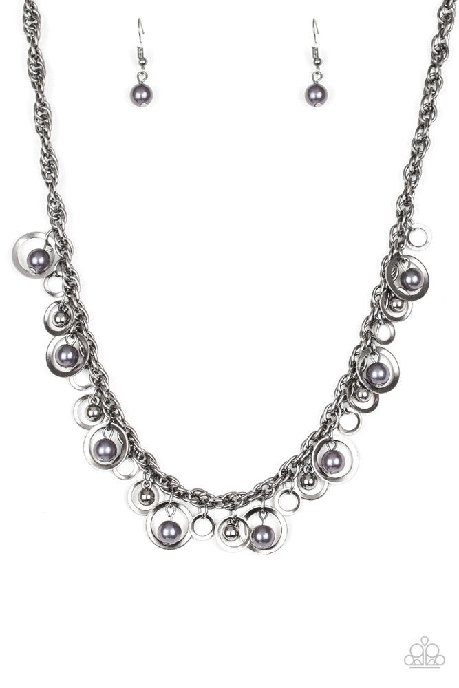Brushed in an antiqued shimmer, mismatched gunmetal hoops, gunmetal pearls, and dainty gunmetal beads swing from the bottom of a bold gunmetal chain below the collar for a refined look. Features an adjustable clasp closure.