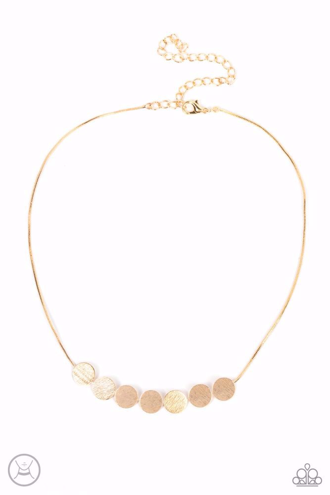 Featuring shimmery scratched surfaces, a glimmering collection of dainty gold discs are fitted in place along a gold snake chain around the neck for a sleek finish. Features an adjustable clasp closure.