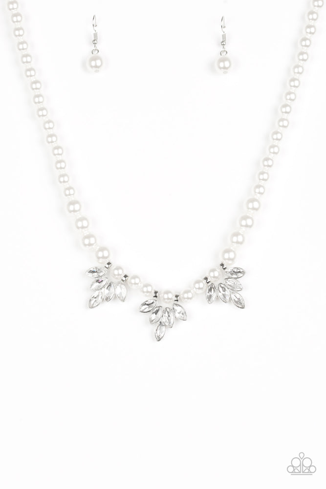 A strand of classic white pearls drapes elegantly below the collar. Featuring regal marquise style cuts, glittery white rhinestone frames swing from the pearls for a timeless finish. Features an adjustable clasp closure.