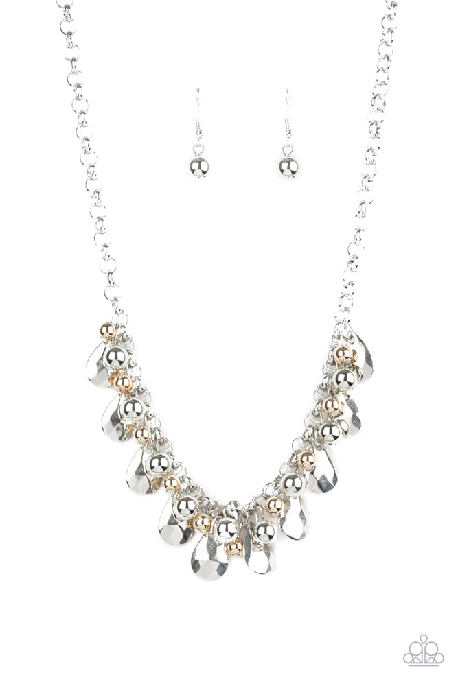 A collection of shiny silver and glistening gold beads join faceted silver teardrops along the bottom of a bold silver chain, creating an edgy fringe below the collar. Features an adjustable clasp closure.