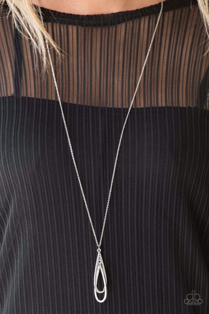 Infused with an elegantly elongated silver chain, a white rhinestone encrusted teardrop interlocks with a smooth silver teardrop, creating a refined pendant. Features an adjustable clasp closure.