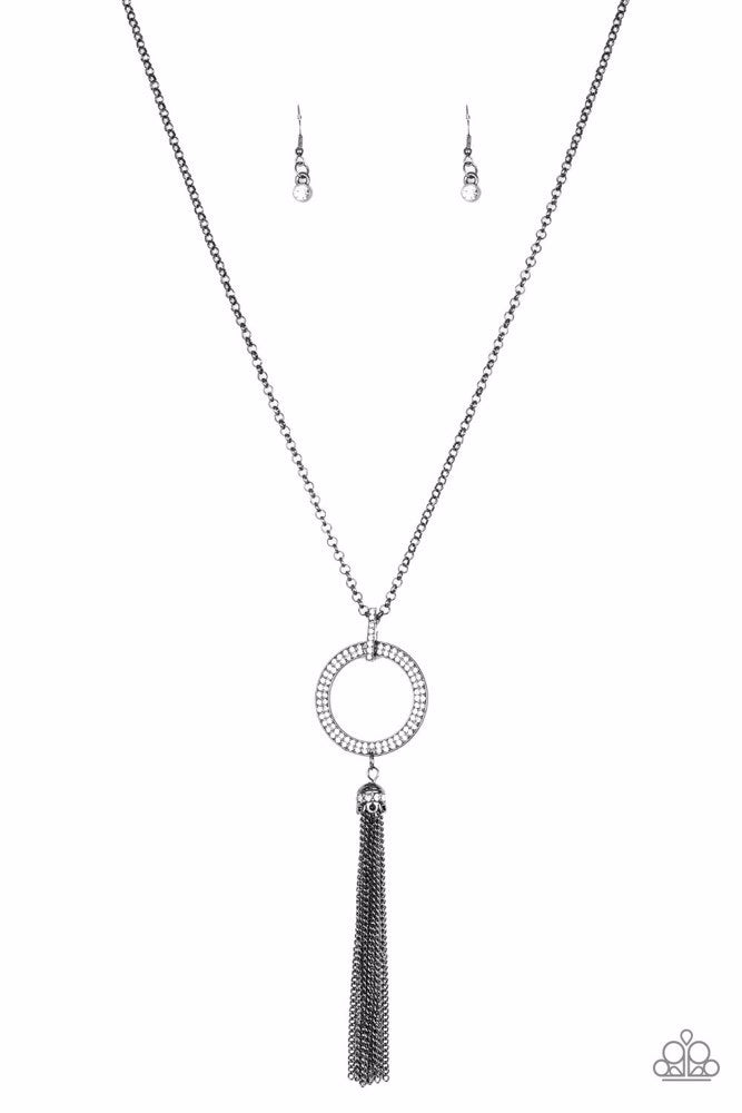 Encrusted in dazzling white rhinestones, a shimmery gunmetal hoop swings from the bottom of an elegantly elongated gunmetal chain for a refined look. A glistening gunmetal tassel swings from the bottom of the glittery pendant for a flirty flair. Features an adjustable clasp closure.