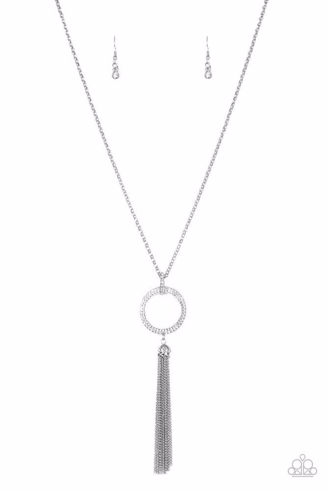 Encrusted in dazzling white rhinestones, a shimmery silver hoop swings from the bottom of an elegantly elongated silver chain for a refined look. A glistening silver tassel swings from the bottom of the glittery pendant for a flirty flair. Features an adjustable clasp closure.