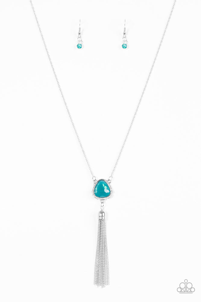 Featuring an opaque shimmer, a glassy blue gem is pressed into a sleek silver frame encrusted in dainty white rhinestones. The glowing pendant gives way to a glistening silver tassel for a whimsical finish. Features an adjustable clasp closure.