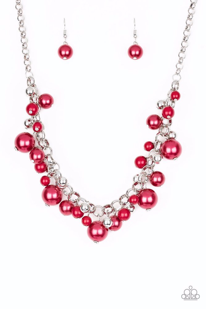 Varying in size, bubbly red pearls, classic silver beads, and shiny red beads swing from the bottom of a glistening silver chain, creating a refined fringe below the collar. Features an adjustable clasp closure